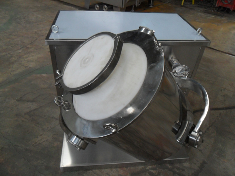 結(jié)構(gòu):該機(jī)由機(jī)座、傳動(dòng)系統(tǒng)、電器控制系統(tǒng)、多向運(yùn)動(dòng)機(jī)構(gòu)、混合筒等部件組成。與物料直接接觸的混合筒采用優(yōu)質(zhì)不銹鋼材料制造,桶體內(nèi)外壁均經(jīng)鏡面拋光。
