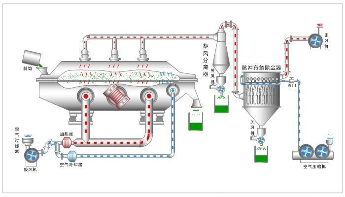 物料自進(jìn)料口進(jìn)入機(jī)內(nèi), 在振動(dòng)力作用下, 物料沿水平方向拋擲向前連續(xù)運(yùn)動(dòng),熱風(fēng)向上穿過(guò)流化床同濕料換熱后, 濕空氣經(jīng)旋風(fēng)分離器除塵后由排風(fēng)口排出, 干燥物料由排料口排出。