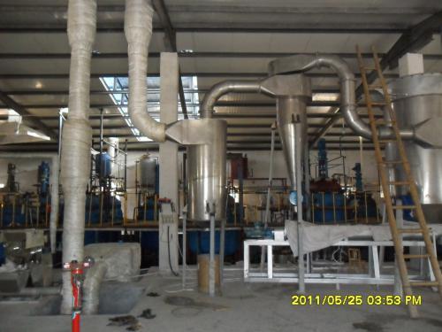 底部強化器設(shè)計獨特,攪拌齒為菱形,其流線性能使風(fēng)阻達到小,設(shè)置在圓錐形料斗內(nèi),分動刀和定刀,粉碎效果顯著,使下落的結(jié)塊物料迅速粉碎為適合氣流干燥的粉粒料,攪拌的另一個主要作用是分散物料,加大了與料斗下面進來的高速熱風(fēng)的接觸面積,于是料斗區(qū)形成了一個強烈傳熱傳質(zhì)的流化床,大部分濕分在料斗區(qū)被干燥。隨著干燥的進行,變輕變細的干料受氣流作用明顯,與氣流一起上升并進一步干燥,后從干燥塔頂部出來進入物料收集系統(tǒng)。